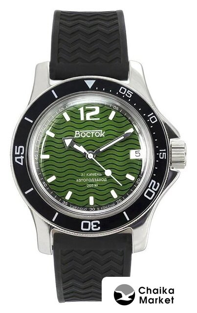 серебристый/черный корпус, зеленый циферблат, черный браслет, силиконовый ремешок