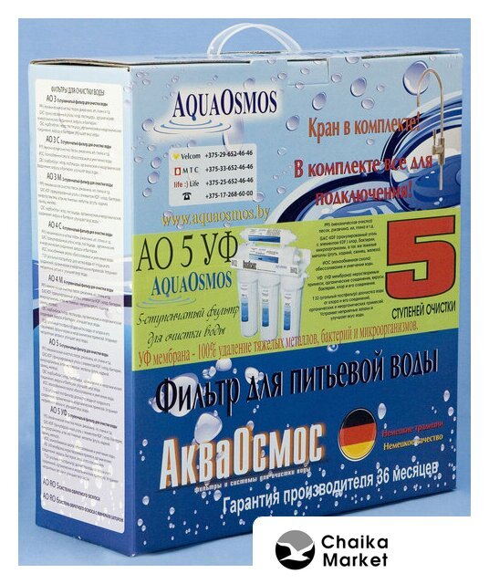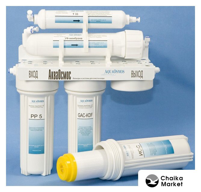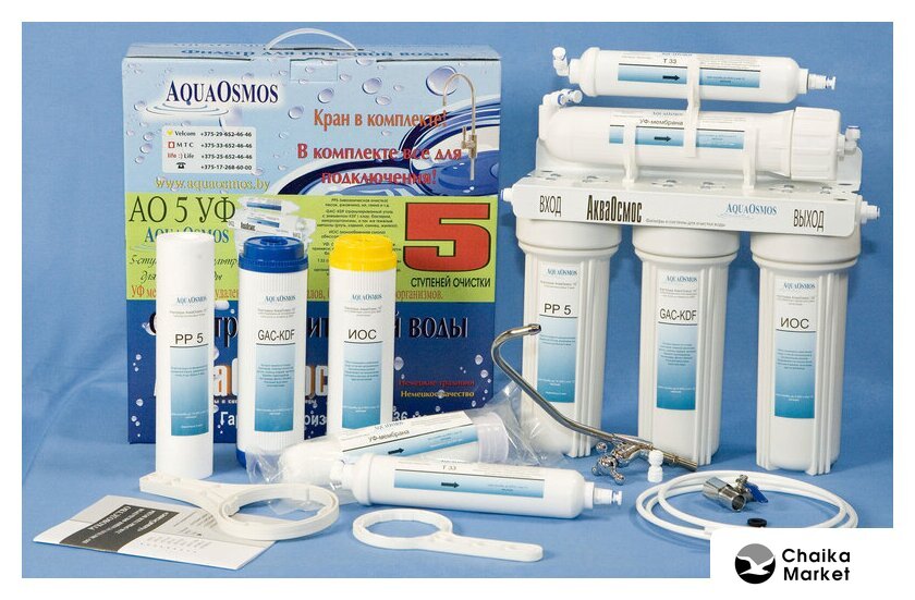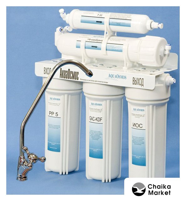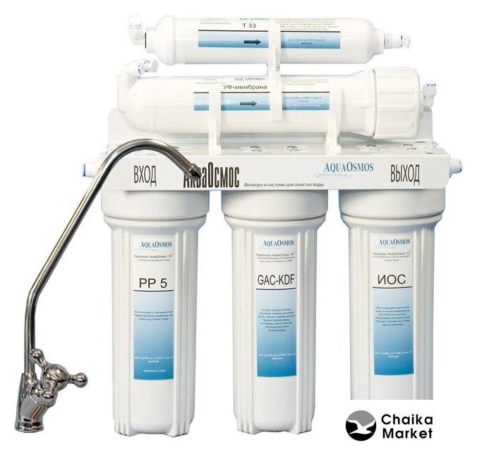 | Описание фильтра | Фильтр для очистки воды АО 5 УФ обеспечивает защиту от сверхжесткой воды, нейтрализует тяжелые металлы, на 100% удаляет вирусы и бактерии. Входит в линейку премиум фильтров компании "АкваОсмос". Является флагманом проточных фильтров нашей компании. По качеству очищенной воды практически не уступает системам обратного осмоса АО RO 5 и АО RO 6. Благодаря пятиступенчатой системе фильтрации фильтр убирает механические частицы (песок, ржавчина, ил, глина и т. д.), хлор, пестициды, органические и неорганические соединения, вирусы и бактерии. Удаляет неприятные запахи, посторонние привкусы, улучшает вкус и качество воды. С помощью картриджа ИОС (ионообменная смола) фильтр задерживает соли жесткости, устраняет накипь, обессоливает и умягчает воду. Картридж GAC-KDF справляется с тяжелыми металлами (ртуть, кадмий, свинец, железо). А УФ мембрана на 100% защищает воду от нерастворимых примесей, органических и неорганических соединений, вирусов и бактерий. В комплектацию входят сам фильтр, комплект картриджей, кран для чистой воды и полный набор для легкого подключения фильтра собственными силами. |