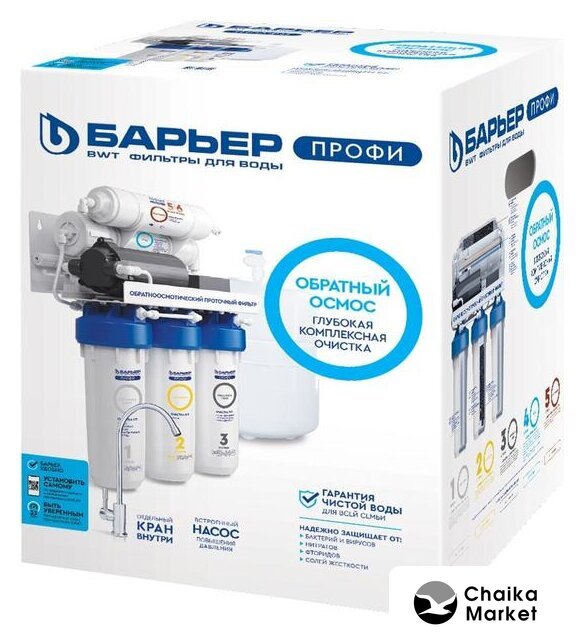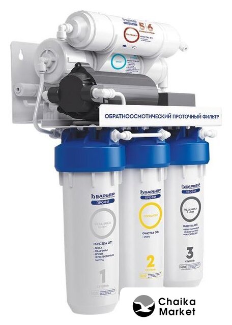 система обратного осмоса, производительность: 0.2 л/мин, ресурс: 5000 л, количество картриджей: 6, насос повышения давления