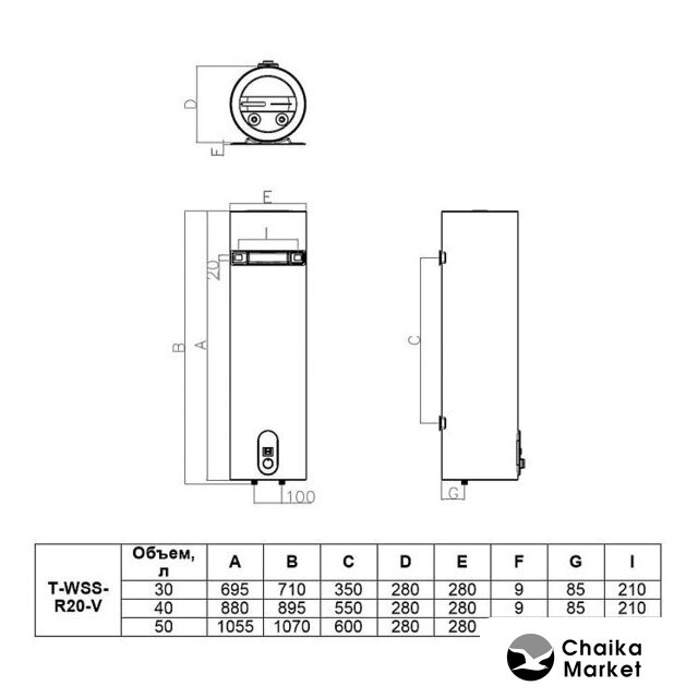 вертикальный, 50 л, 2 кВт, время нагрева 70 мин, 84×43.6×25.8 см