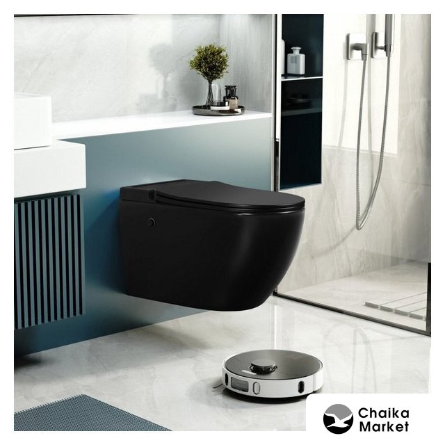 подвесной, конструкция: без бачка, задний подвод воды, горизонтальный выпуск, двухрежимный слив, с сиденьем, безободковый