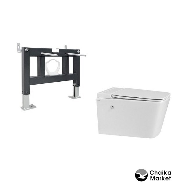 подвесной, конструкция: без бачка, задний подвод воды, горизонтальный выпуск, двухрежимный слив, с сиденьем, безободковый