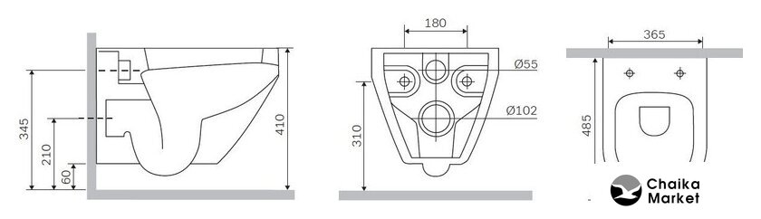 подвесной, задний подвод воды, горизонтальный выпуск, двухрежимный слив, безободковый