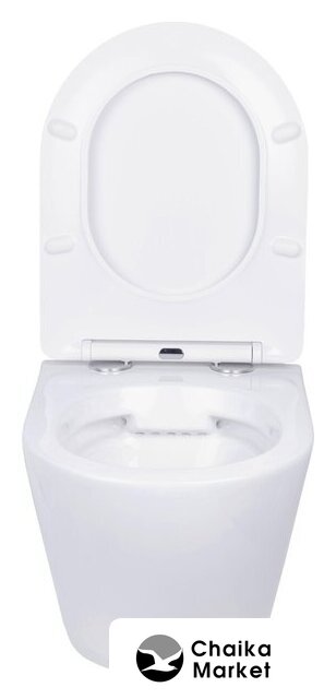 подвесной, конструкция: без бачка, задний подвод воды, горизонтальный выпуск, двухрежимный слив, с сиденьем, безободковый