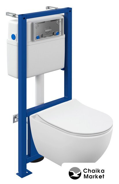 подвесной, конструкция: без бачка, задний подвод воды, горизонтальный выпуск, двухрежимный слив, с сиденьем, безободковый