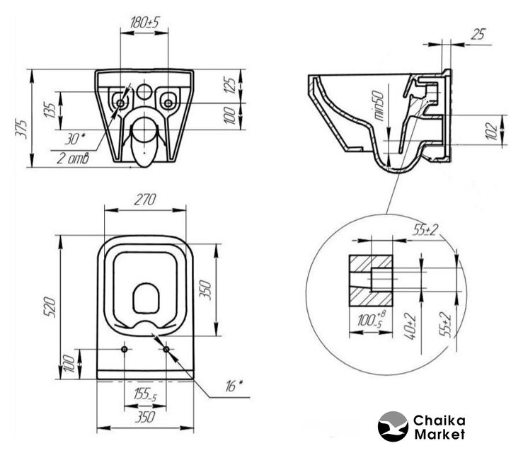 подвесной, конструкция: без бачка, горизонтальный выпуск, с сиденьем, безободковый