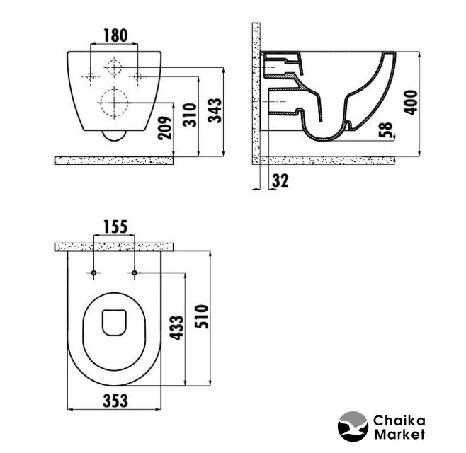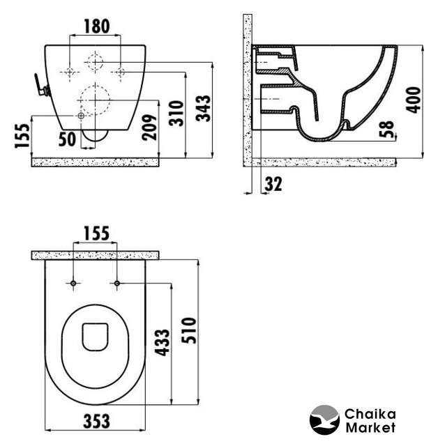 подвесной, задний подвод воды, горизонтальный выпуск, двухрежимный слив, с сиденьем, безободковый