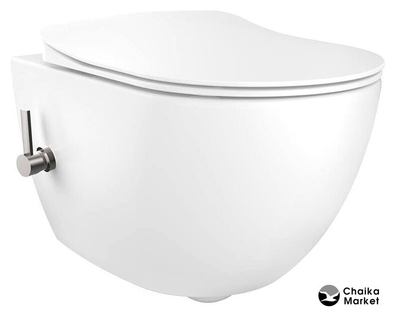 подвесной (с биде), конструкция: без бачка, задний подвод воды, горизонтальный выпуск, двухрежимный слив, с сиденьем, безободковый