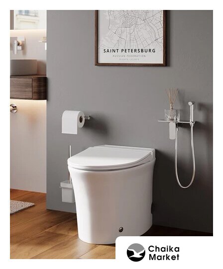 приставной (с биде), конструкция: без бачка, задний подвод воды, горизонтальный выпуск, двухрежимный слив, с сиденьем, безободковый