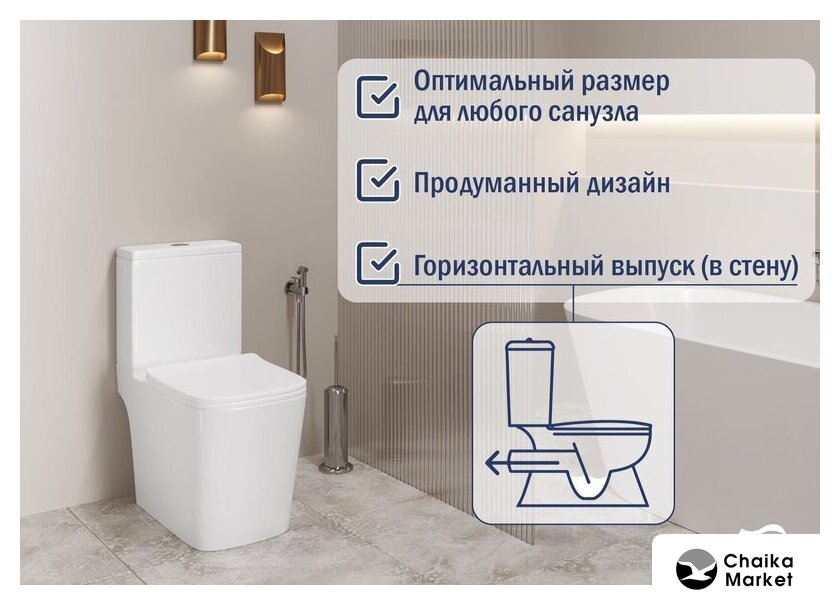 напольный, конструкция: компакт, нижний подвод воды, горизонтальный выпуск, двухрежимный слив, с сиденьем