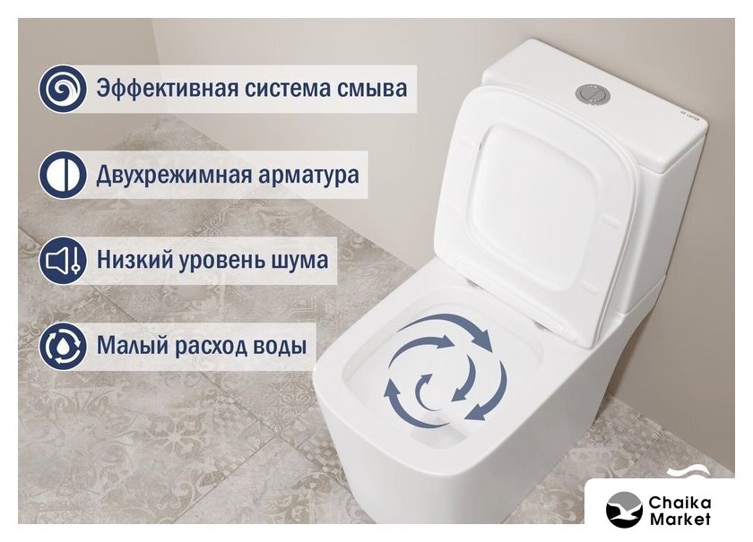напольный, конструкция: компакт, горизонтальный выпуск, двухрежимный слив, с сиденьем, безободковый