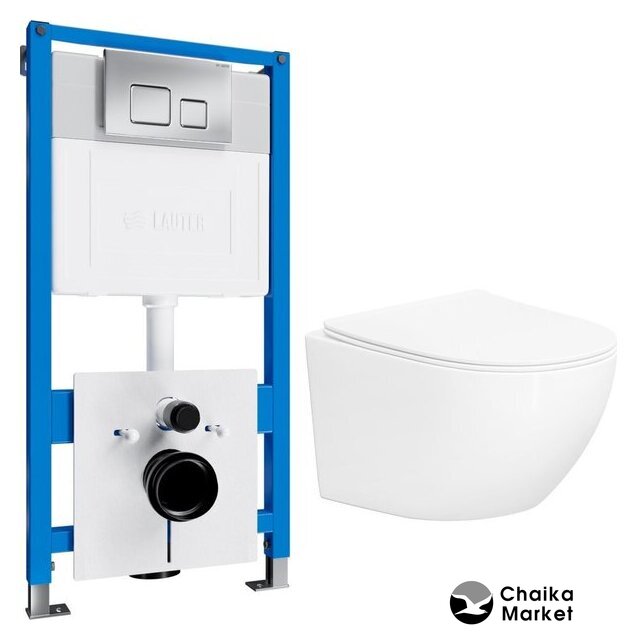 подвесной, конструкция: без бачка, задний подвод воды, горизонтальный выпуск, двухрежимный слив, с сиденьем, безободковый