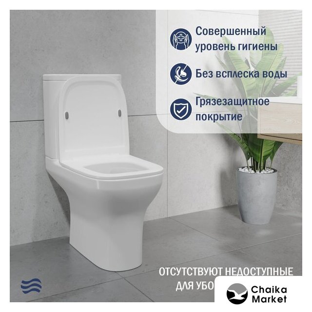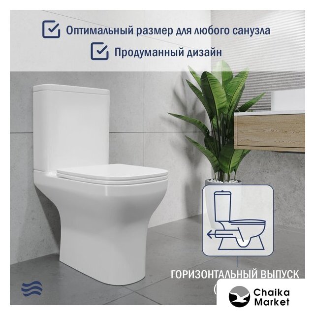 напольный, конструкция: компакт, горизонтальный выпуск, двухрежимный слив, с сиденьем, безободковый