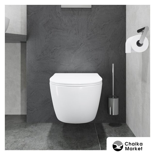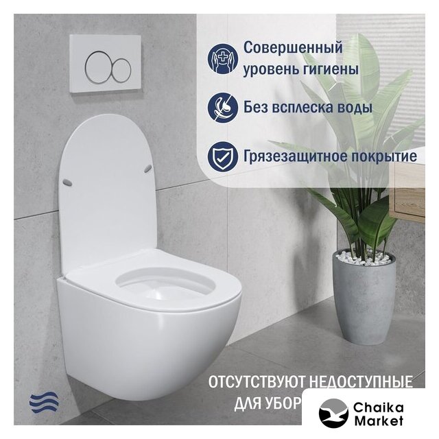 подвесной, конструкция: без бачка, задний подвод воды, горизонтальный выпуск, однорежимный слив, с сиденьем, безободковый