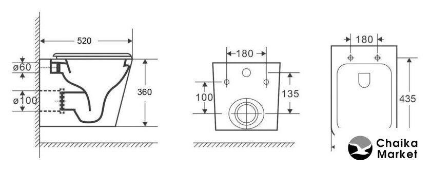 подвесной, конструкция: без бачка, задний подвод воды, горизонтальный выпуск, однорежимный слив