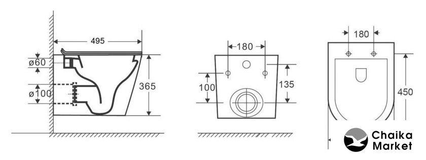 подвесной, конструкция: без бачка, задний подвод воды, горизонтальный выпуск, однорежимный слив