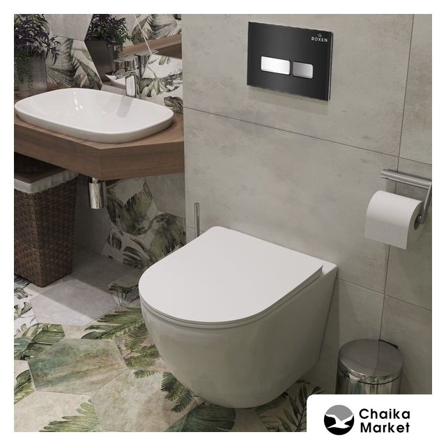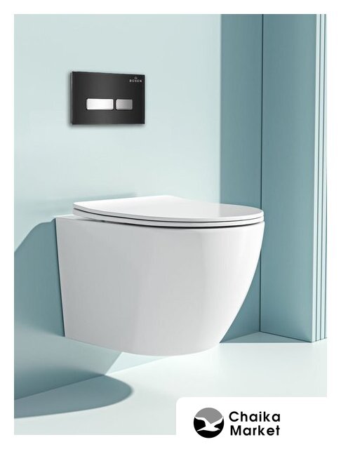 подвесной, без бачка, задний подвод воды, горизонтальный выпуск, двухрежимный слив, с сиденьем