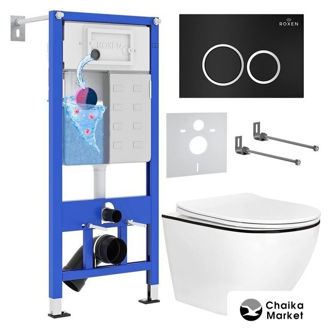 Унитаз подвесной Roxen Vortex Tornado в комплекте с инсталляцией StounFix Dual Fresh 6 в 1 964498 (кнопка: черный матовый) — Chaika Market