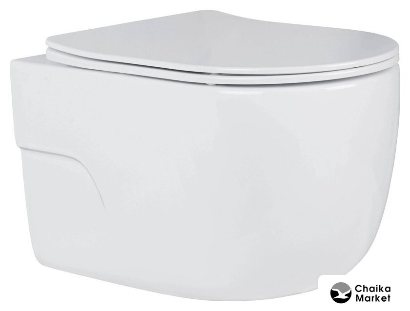 подвесной, конструкция: без бачка, задний подвод воды, горизонтальный выпуск, двухрежимный слив, с сиденьем, безободковый