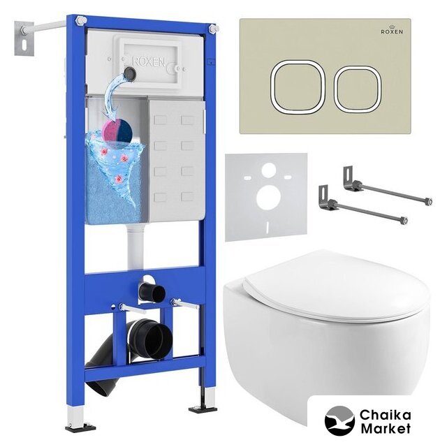 Унитаз подвесной Roxen Antares 530185-02 в комплекте с инсталляцией StounFix Dual Fresh 6 в 1 966195 (кнопка: бежевый) — Chaika Market