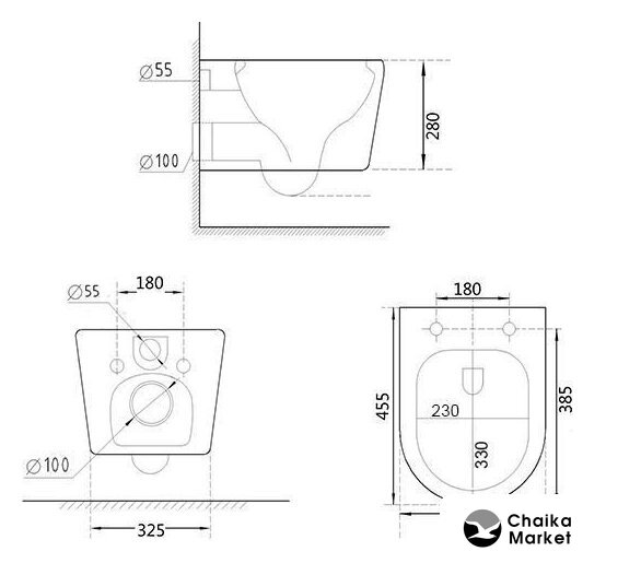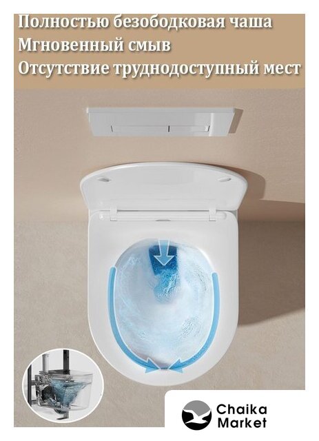 подвесной, без бачка, задний подвод воды, горизонтальный выпуск