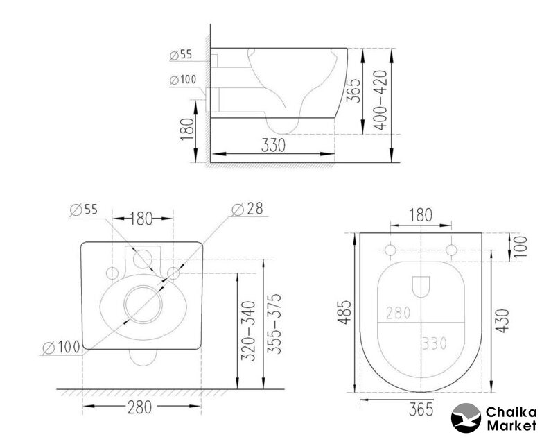 подвесной, без бачка, задний подвод воды, горизонтальный выпуск