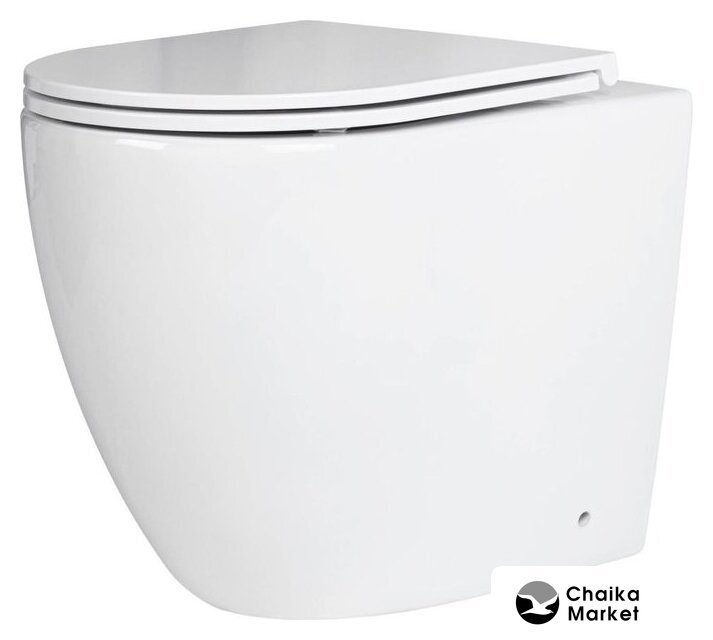 приставной, конструкция: без бачка, задний подвод воды, горизонтальный выпуск, однорежимный слив, с сиденьем, безободковый