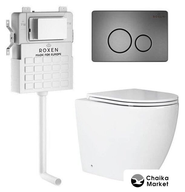 приставной, конструкция: без бачка, задний подвод воды, горизонтальный выпуск, двухрежимный слив, с сиденьем, безободковый