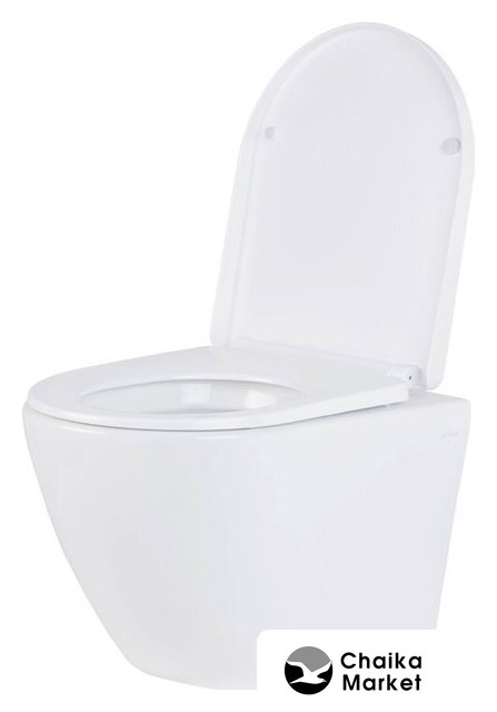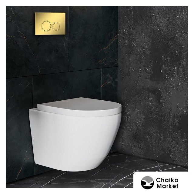 подвесной, конструкция: без бачка, задний подвод воды, горизонтальный выпуск, двухрежимный слив, с сиденьем, безободковый