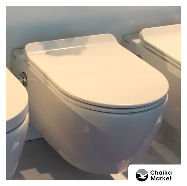 подвесной, конструкция: без бачка, задний подвод воды, горизонтальный выпуск, двухрежимный слив, с сиденьем, безободковый
