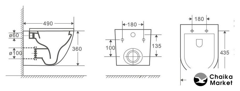 подвесной, без бачка, задний подвод воды, горизонтальный выпуск