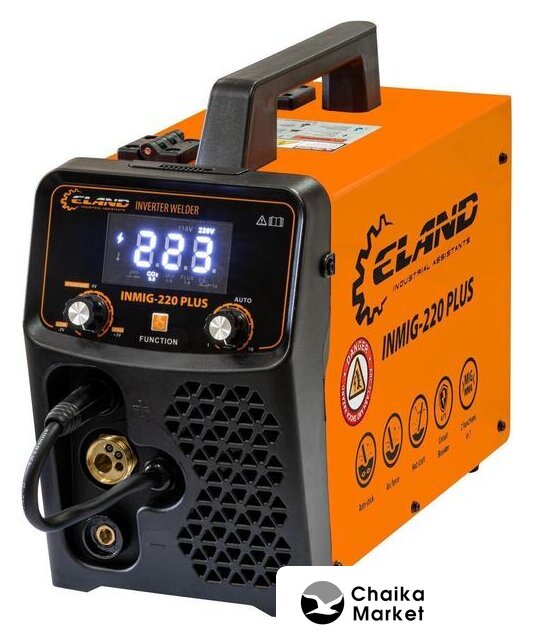 ручная дуговая сварка (MMA)/полуавтоматическая сварка (MIG MAG FCAW), входное напряжение 220 В, сварочный ток: 20–210 А, диаметр электрода: 2–4 мм, 8.8 кг