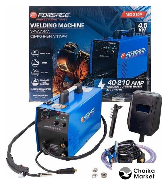 ручная дуговая сварка (MMA)/полуавтоматическая сварка (MIG MAG), 220 В, сварочный ток: 20–200 А, диаметр электрода: 1.6–4 мм, 6 кг