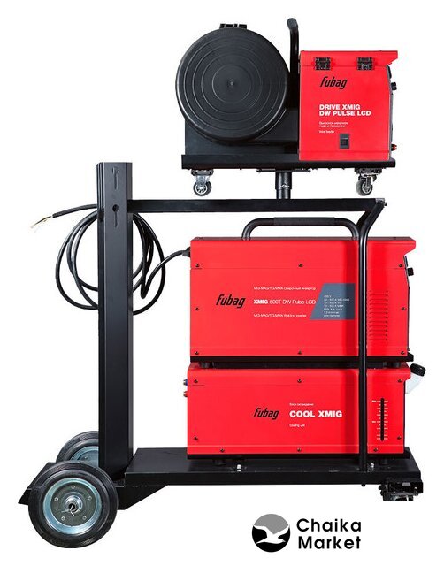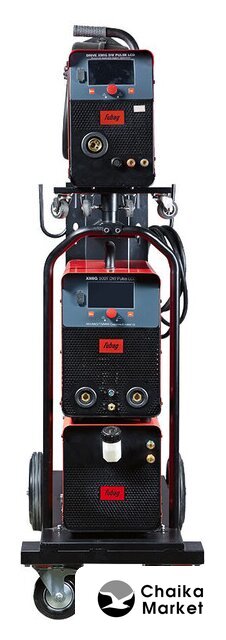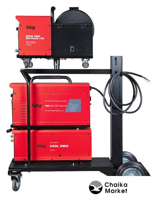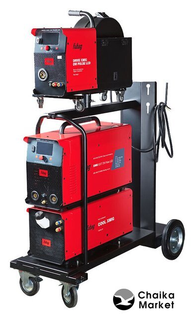 Комплект поставки | горелка (FB 550, 3 м), устройство подачи проволоки, тележка (XM), шланг-пакет (5 м, с жидкостным охлаждением), блок охлаждения (Cool XMIG) |