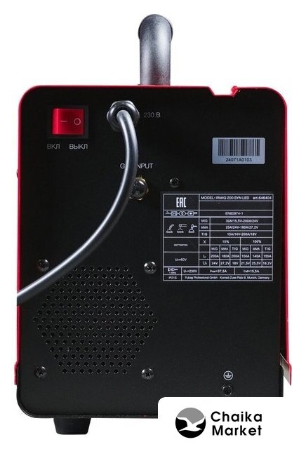 Максимальный сварочный ток | 200 А (MMA: 180; TIG: 200) |