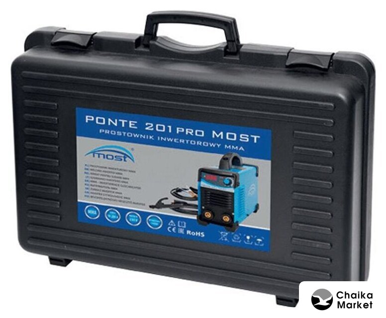 Комплект поставки | - Сварочный инвертор MOST PONTE 201;- Сетевой кабель 3G2,5 мм2 с вилкой для подключения – 2,3 метра;- Сварочный кабель 1x25 мм2 с электрододержателем и байонетным разъемом 35/50 – 3,0 метра;- Сварочный кабель 1x25 мм2 с зажимом массы и байонетным разъемом 35/50 – 3,0 метра;- Инструкция по эксплуатации;- Пластиковый кейс |