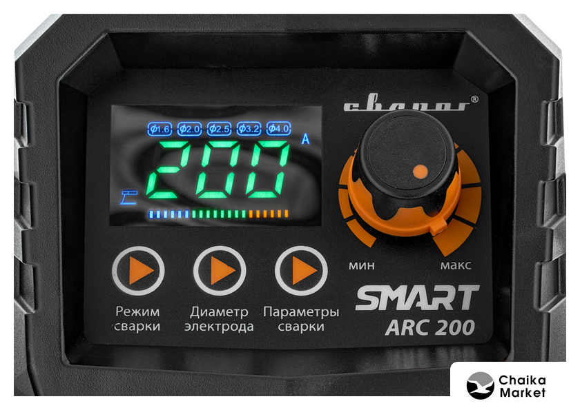 ручная дуговая сварка (MMA)/полуавтоматическая сварка (MIG MAG)/аргонодуговая сварка (TIG), 220 В, сварочный ток: 20–200 А, диаметр электрода: 1.6–4 мм, 6 кг