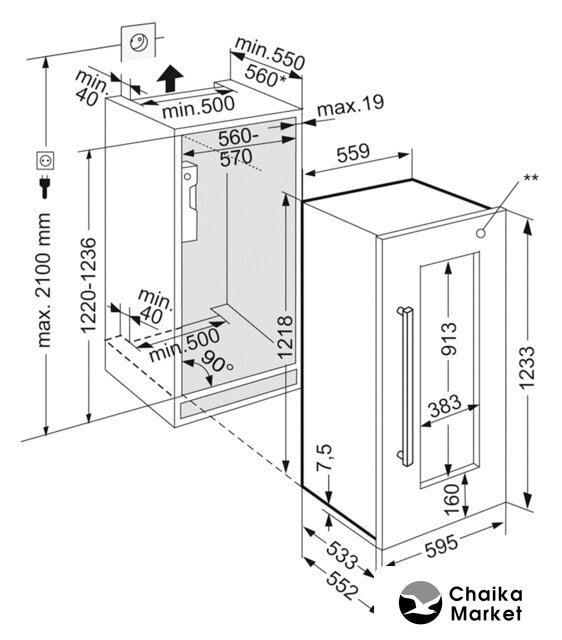 встраиваемый, 2 зоны температуры, 33 бутылки