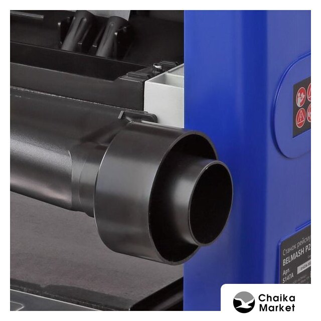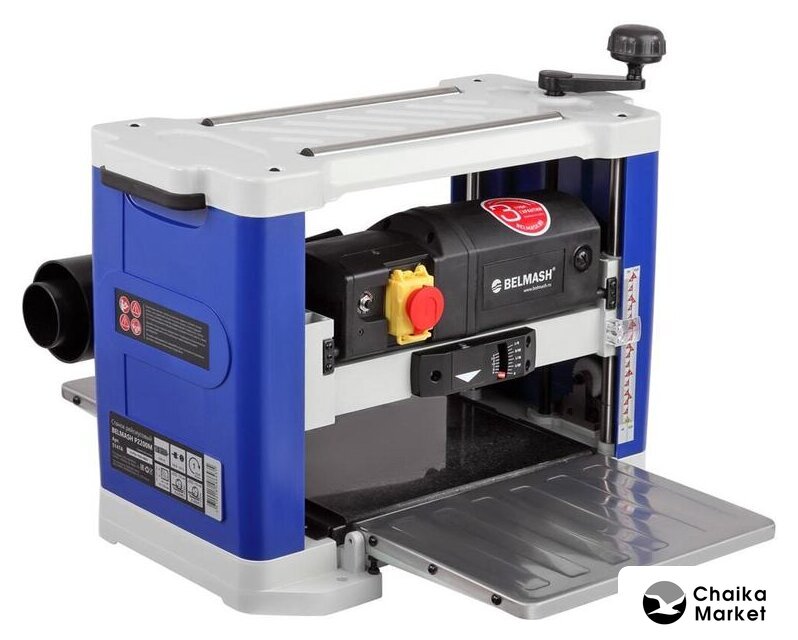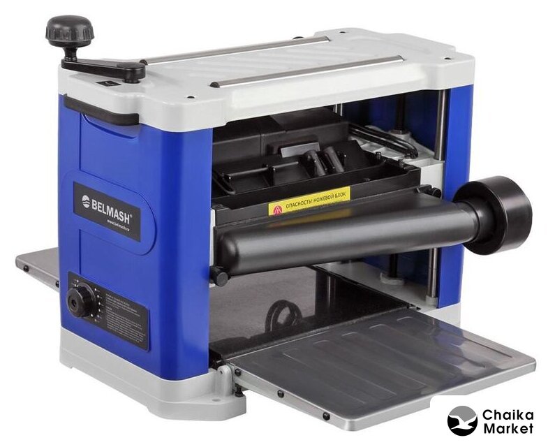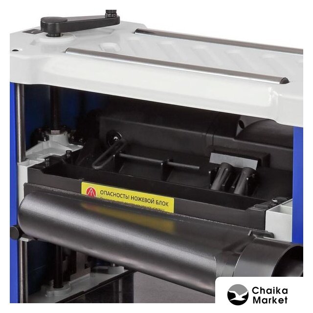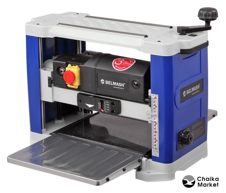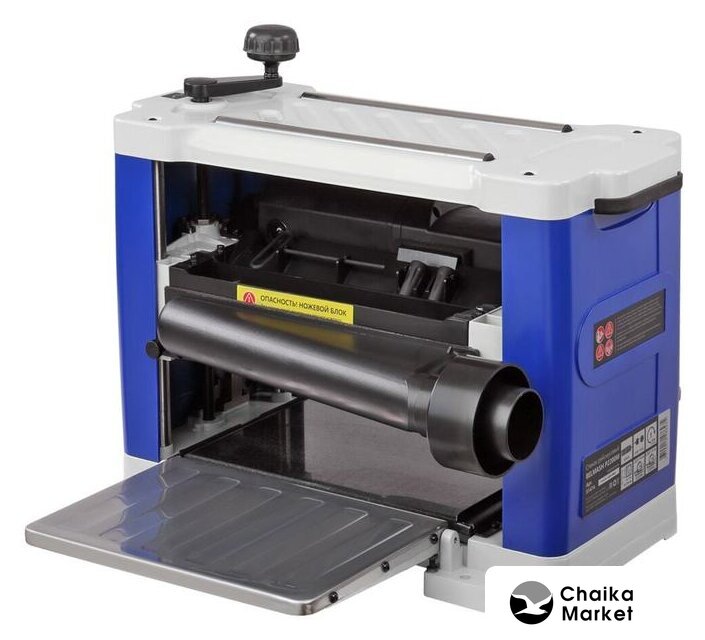 Комплект поставки | - Станок рейсмусовый;- Ручка в сборе;- Шайба плоская;- Болт;- Ключ шестигранный;- Кожух стружковыброса;- Винт-барашек - 2;- Переходник/адаптер;- Магнит - 2;- Нож строгальный* - 3;- Руководство по эксплуатации;- Упаковка.* позиция поставляется в сборе |