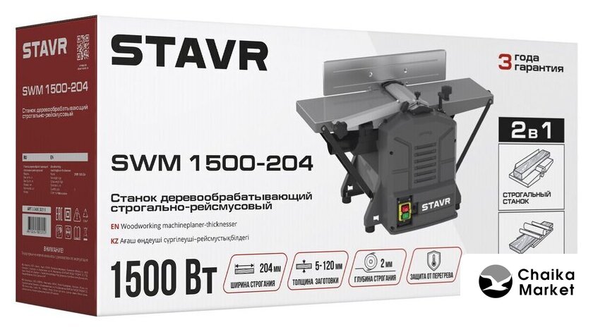Комплект поставки | - станок, - параллельный упор, - защитная планка с кронштейном, - рукоятка регулировки высоты рабочего стола, - рукоятка регулировки глубины строгания, - пылесборник с переходником, - толкатели (2 шт), - шаблон для настройки ножей, - ключ шестигранный (3 шт),- ключ торцевой, - резиновые опоры с винтами (4 шт), - руководство по эксплуатации. |