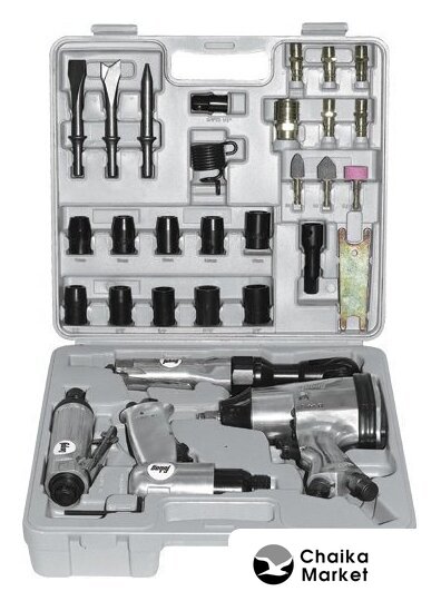 Комплектация | В комплект набора входят: пневмодолото, 3 зубила 120 мм с круглым хвостовиком, пневмогайковерт, 10 головок 1/2", 1 угловой пневмогайковерт, пневмошлифмашина, 3 шлифкамня 6 мм, 1 ключ шестигранный 6 мм, 1 разъем рапид муфта, 2 гаечных ключа, 1 возвратная пружина, 6 разъемов рапид штуцер, 1 удлинитель 1/2" на 75", 1 масленка, 1 переходник 3/8" на 1/2" |