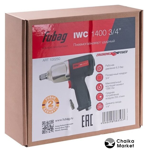 ударный, 1900 Нм, 7500 об/мин, расход воздуха: 239 л/мин, давление: 6.2 бар, 2100 г