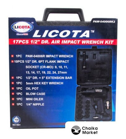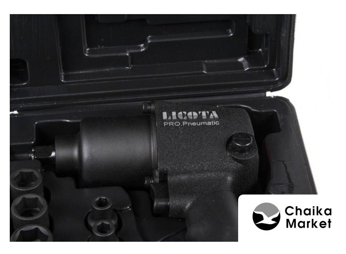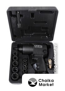 | Комплектация | - Гайковерт пневматический ударный - Ударные головки, 9, 10, 11, 13, 14, 17, 19, 22, 24, 27- Ударный удлинитель, 125 мм- Г-образный ключ- Масленка- Линейный лубрикатор- Штуцер для подключения к пневмолинии- Пластиковый кейс |