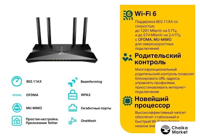 802.11ax (Wi-Fi 6), 2.4 ГГц/5 ГГц, до 1500 Mbps, WAN, 4xGigabit LAN