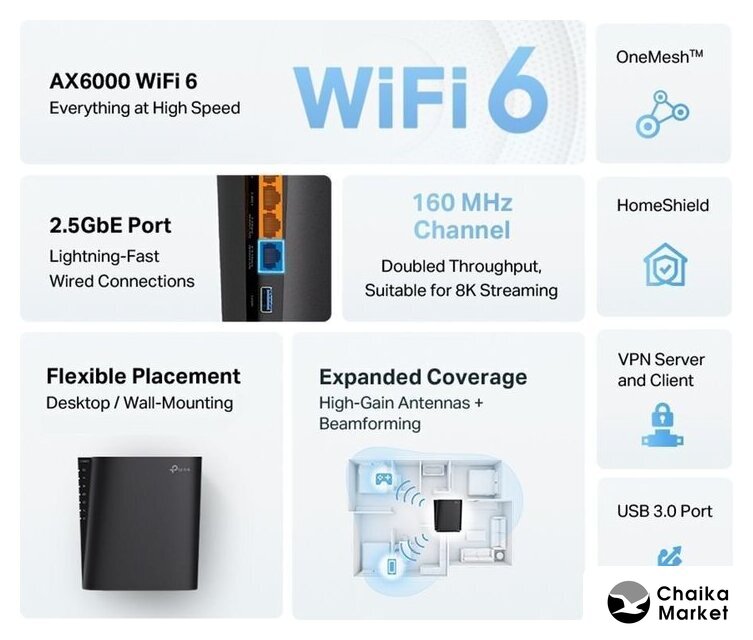 802.11ax (Wi-Fi 6), 2.4 ГГц/5 ГГц, до 3000 Mbps, WAN, 2xGigabit LAN, 1xUSB