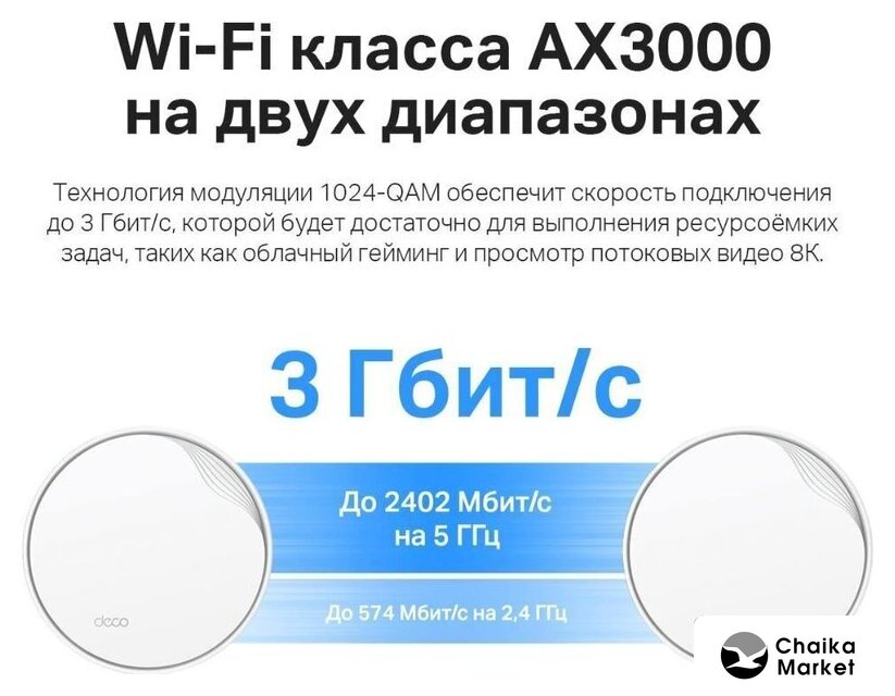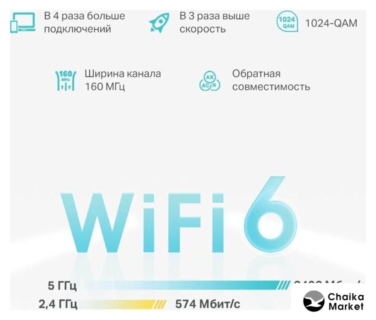 802.11ax (Wi-Fi 6), 2.4 ГГц/5 ГГц, до 2976 Mbps, WAN, 3xGigabit LAN