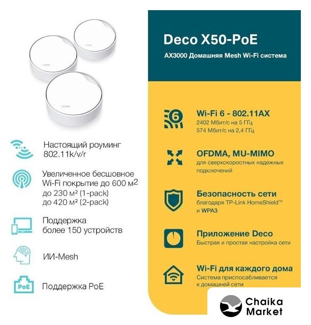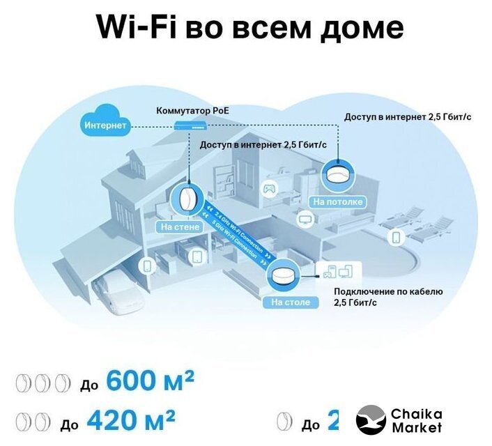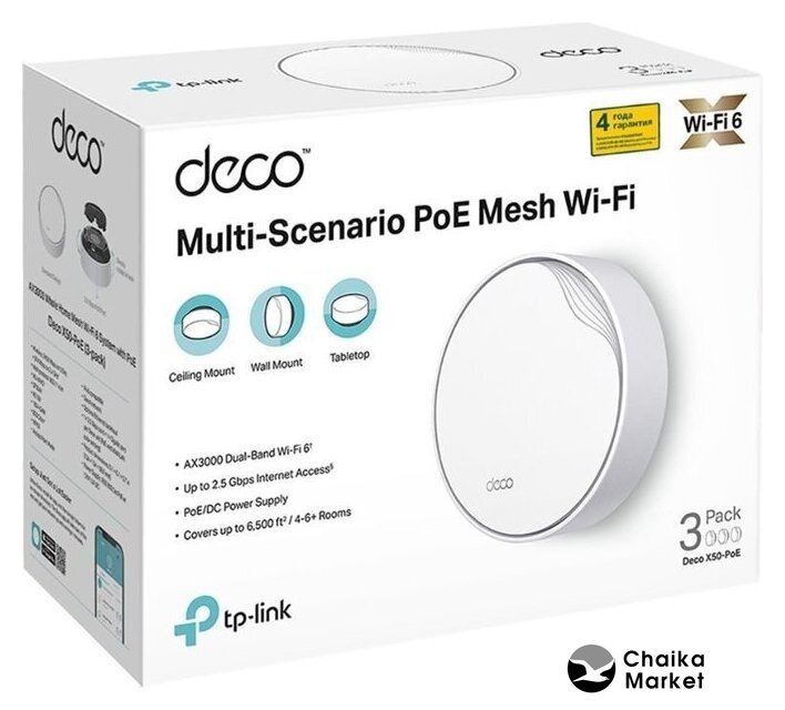 | Комплектация | Mesh-модуль (3 шт.)Кабель Ethernet RJ45Адаптер питания (3 шт.)Крепления для монтажа на потолке или на стенеКраткое руководство по настройке |