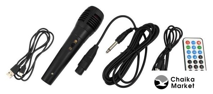| Комплектация | - пульт ДУ- один ручной микрофон- AUX кабель- кабель для зарядки- документация |