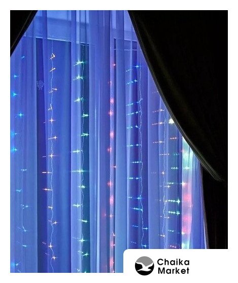 дождь (занавес), для использования в помещении/на улице, длина 9 м, 1200 ламп, питание от сети, свечение мерцающее, IP65, провод черный резиновый